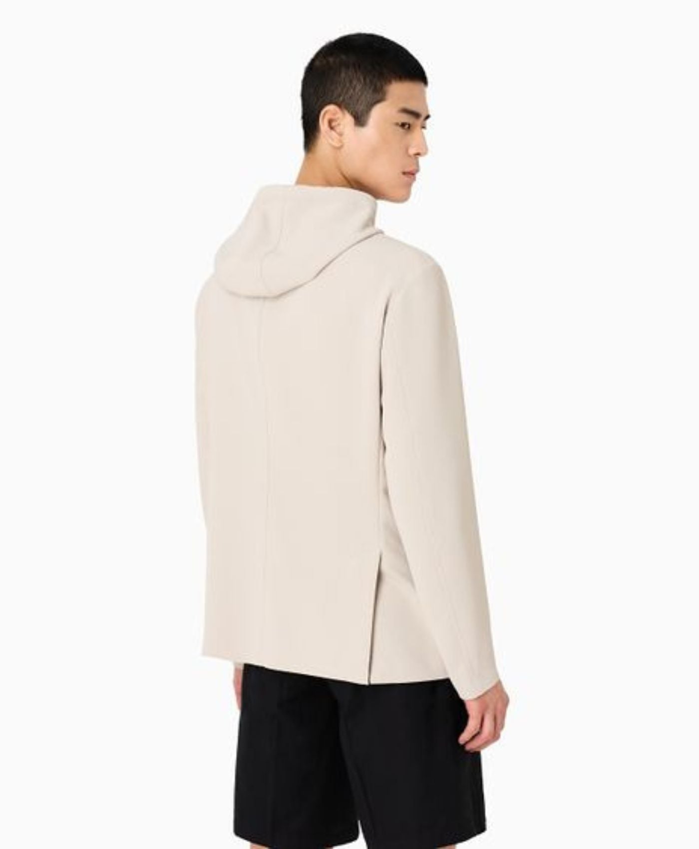 Blazer de abotonadura sencilla, cuello con solapas y bolsillo para pañuelo, confeccionado con un tejido formado por un denso canalé en relieve típico del tejido canneté. La pechera interna con capucha, extraíble gracias a la cremallera, define la dualidad de la prenda, que puede lucirse en distintas ocasiones según el look deseado. La comodidad de una prenda cómoda y práctica lista para acompañarte en cada desplazamiento cotidiano.