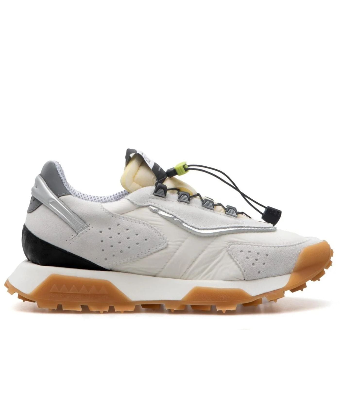 Zapatillas deportivas para hombre en ante blanco , nailon blancoy piel estampada negra, con sistema de cierre de cordones rápido, tira de talón reflectante gris y soporte posterior acolchado de poliéster.