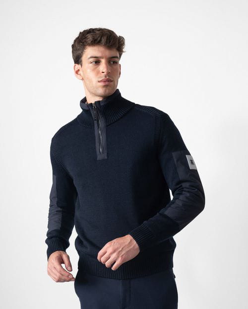 ersey "retro-marinero" con cuello alto de cremallera. Realizado en un punto cerrado de lana mezcla a la que se le aplica un lavado para conseguir un tacto más suave. Presenta apliques de tejido técnico en las mangas y el cuello, estructura de fantasía en los hombros y las sisas, y cuello de canalé. Una pieza muy especial para un invierno con clase, realizado en punto de lana mezcla de doble cara. Joven, casual y a la vez elegante.