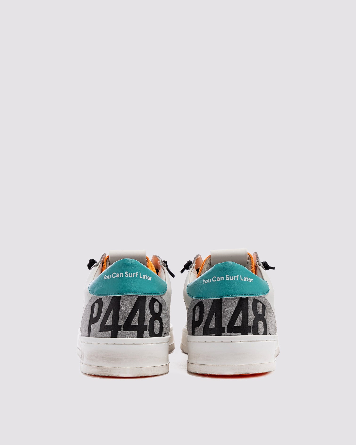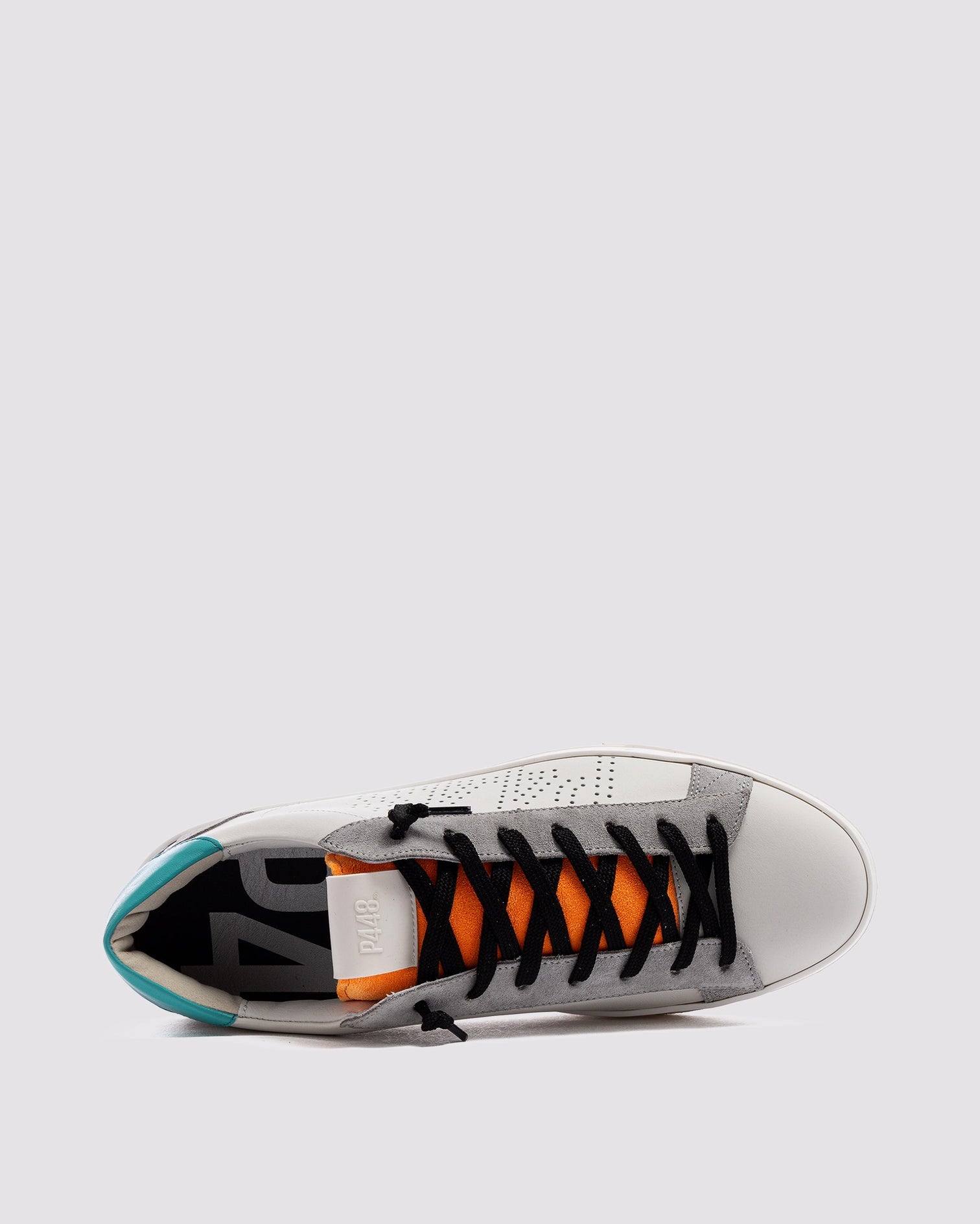 Las Jack Acqua Orange presentan una parte superior completamente de cuero blanco con detalles en gamuza gris, una lengüeta de gamuza naranja fluorescente y una lengüeta trasera de cuero azul claro. Los cordones negros, nuestra suela P448 con efecto desgastado a mano y la suela de color fucsia completan el diseño. Para un toque de brillo, puedes añadir un par de cordones plateados adicionales.