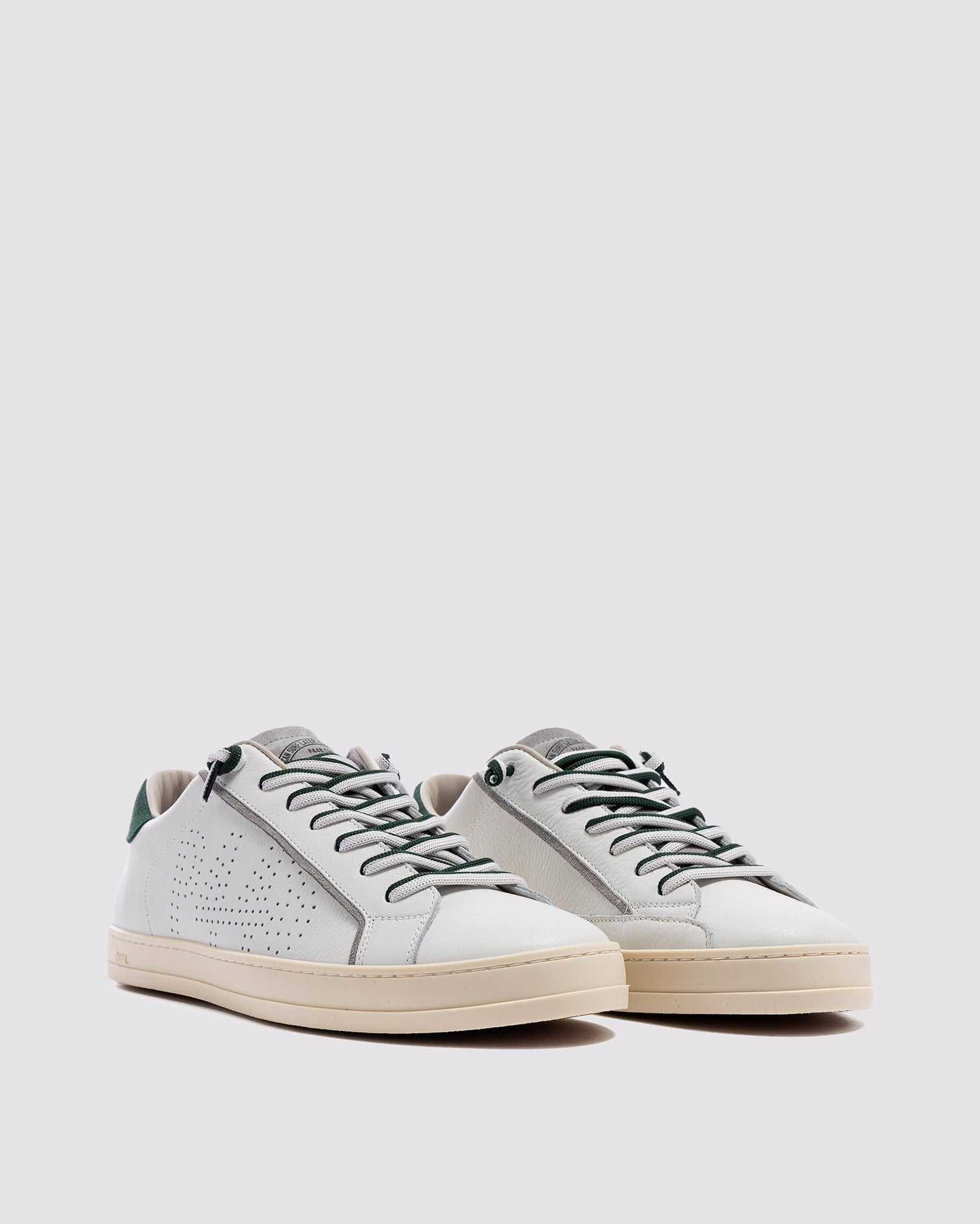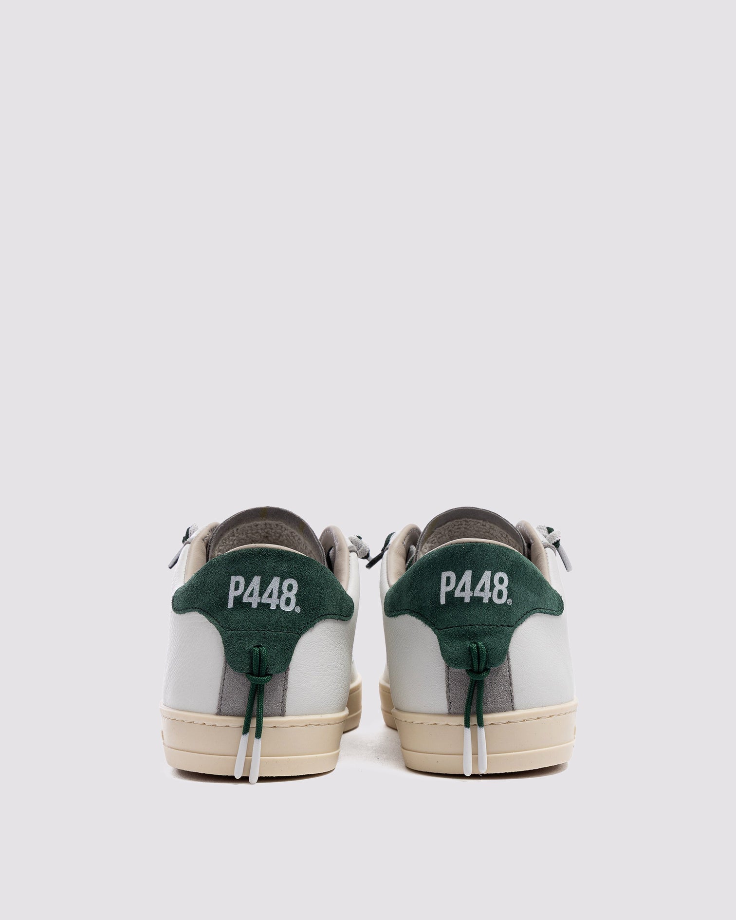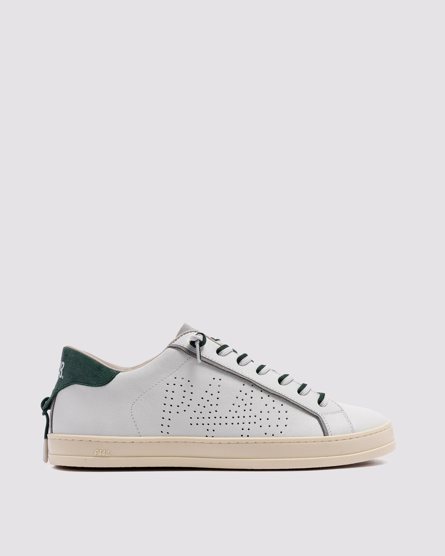 El John White Forrest está revestido de cuero blanco y ante gris, realzado por una tira de ante verde en el talón, cordones en blanco roto y verde a juego y un adorno de encaje verde. Nuestra distintiva suela de goma P448 realza el look. Cambia el par de cordones blancos adicionales para completar el look.